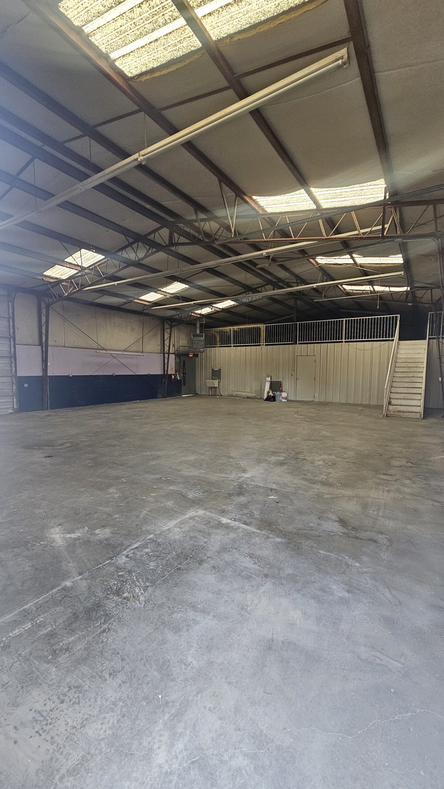 - Metal building is 40′ X 80′, 3200 sq. ft. Includes fenced yard in back and parking in front. 2 Large garage doors in front, 1 in back. Upstairs Mezzanine, great storage space.